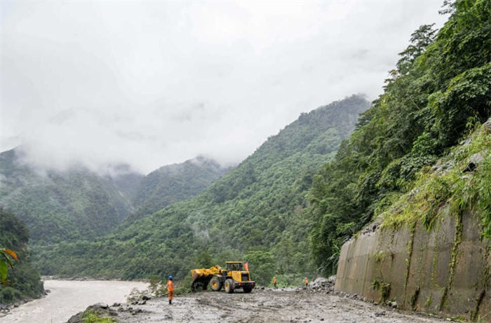 在墨脱县格当乡,工作人员在抢通道路(2023年10月12日摄)。新华社记者 孙非 摄