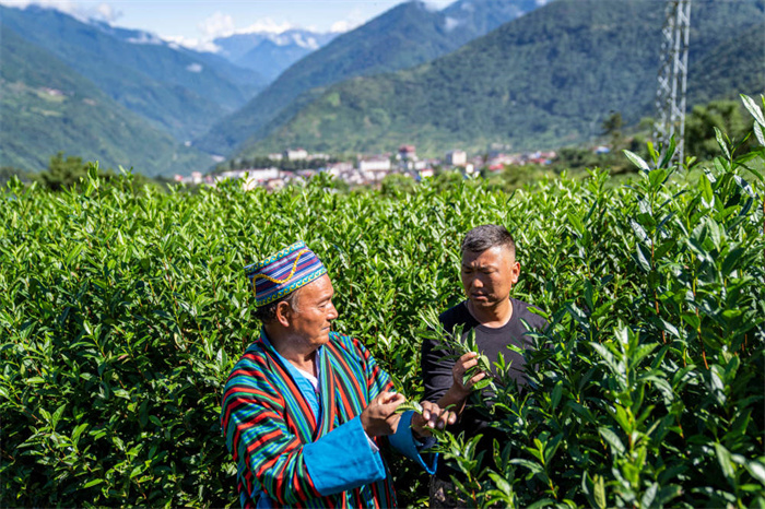 墨脱村村委会副主任达瓦次仁(右)查看茶叶生长情况(2023年10月13日摄)。新华社记者 孙非 摄