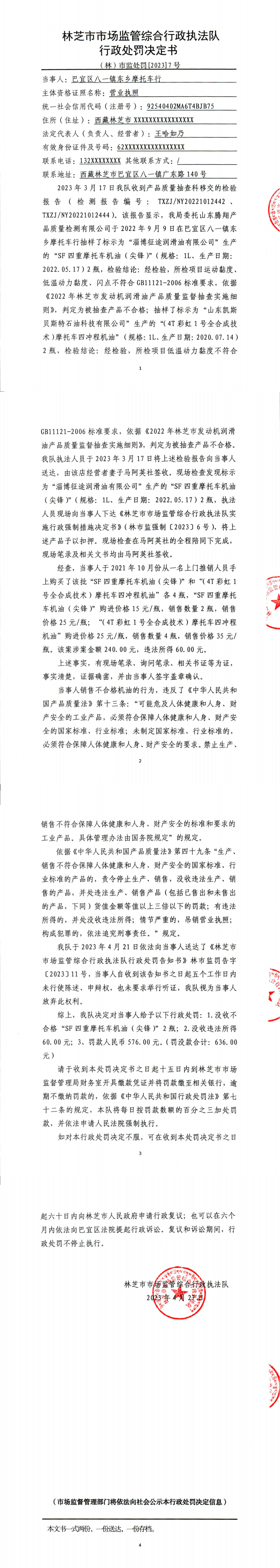 关于公示巴宜区八一镇东乡摩托车行销售不合格机油行政处罚决定-7号